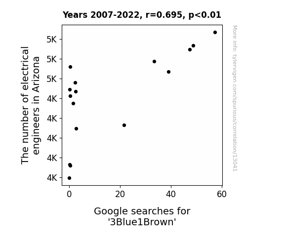 This means 48.4% of the change in the one variable (i.e., Google searches for '3Blue1Brown') is predictable based on the change in the other (i.e., The number of electrical engineers in Arizona) over the 16 years from 2007 through 2022.