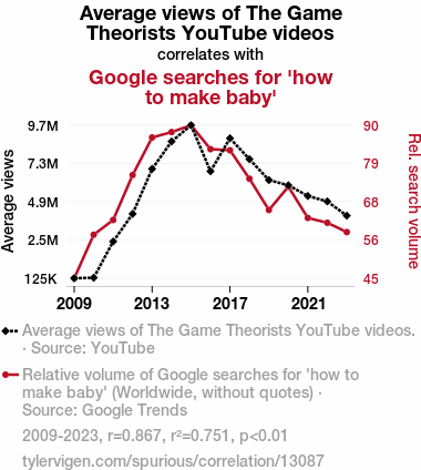 This means 75.1% of the change in the one variable (i.e., Google searches for 'how to make baby') is predictable based on the change in the other (i.e., Average views of The Game Theorists YouTube videos) over the 15 years from 2009 through 2023.