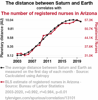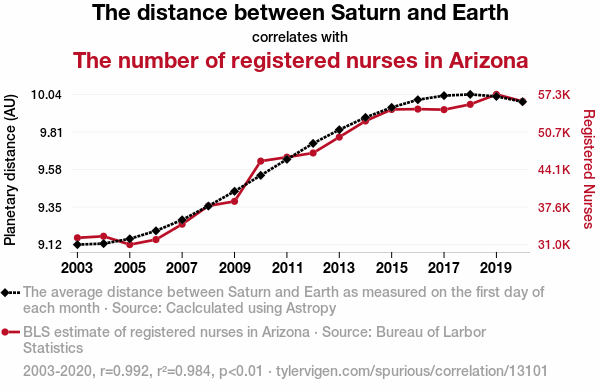 This means 98.4% of the change in the one variable (i.e., The number of registered nurses in Arizona) is predictable based on the change in the other (i.e., The distance between Saturn and Earth) over the 18 years from 2003 through 2020.