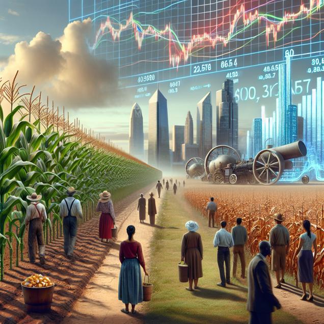 User prompt: Please respond with an image generation prompt that would be likely to create an interesting visual using DALLE-3, using the following style: [ Futuristic ] and depicting this scene: In a vast cornfield in South Dakota, farmers are using genetically modified seeds to grow abundant crops. The strong stalks of genetically modified corn stand tall, with lush green leaves and mature golden ears. Meanwhile, in a bustling financial district, a large digital screen displays the fluctuating stock price of Rogers Communications. Traders are closely monitoring the movements, while the iconic Rogers Communications logo is prominently displayed on the screen. Keep the visual depiction simple. Do not include any words or speech bubbles.