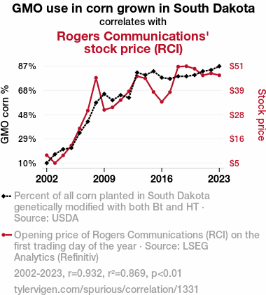 As South Dakota corn became more genetically modified, it developed a natural ability to transmit positive vibes. These vibes were inexplicably in sync with Rogers Communications' business philosophy, creating a strange but undeniable link between the two. As a result, the stock price of Rogers Communications (RCI) experienced an unexpected boost, riding the wave of good vibes all the way to financial success. It seems the key to a fruitful investment may just be growing GMO corn in sync with the stock market!