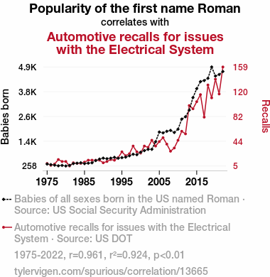 This means 92.4% of the change in the one variable (i.e., Automotive recalls for issues with the Electrical System) is predictable based on the change in the other (i.e., Popularity of the first name Roman) over the 48 years from 1975 through 2022.