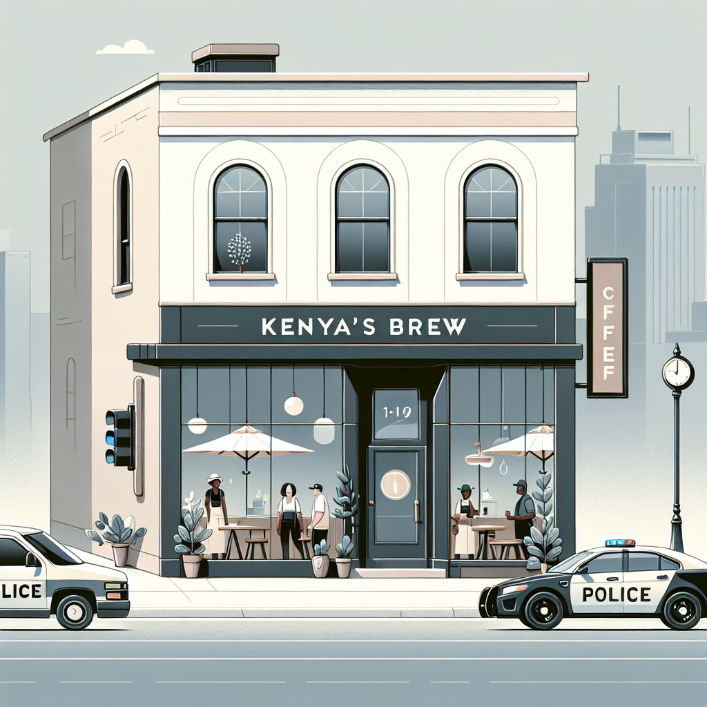 ChatGPT: Generate an image of "Kenya's Brew," a minimalistic coffee shop, in a bustling Indiana city. Show an exterior shot with a small, elegant sign and a few customers visible through the large, inviting windows. Meanwhile, a simplistic representation of a police car drives by on the peaceful street outside as a nod to the city’s safety.
