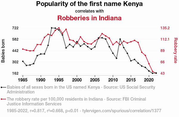 Kenya name popularity, Indiana robberies, correlation analysis, US Social Security Administration data, FBI Criminal Justice Information Services, Kenya name cultural influence, nomenclature and criminal behavior, unusual statistical correlations