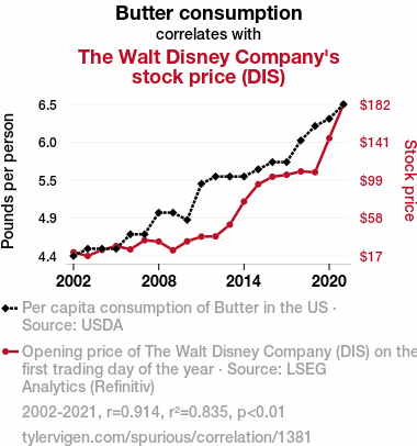 This means 83.5% of the change in the one variable (i.e., The Walt Disney Company's stock price (DIS)) is predictable based on the change in the other (i.e., Butter consumption) over the 20 years from 2002 through 2021.