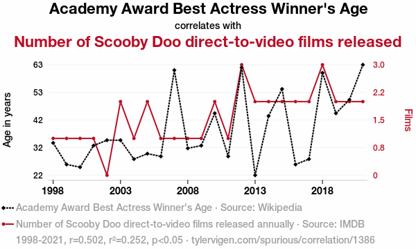 User prompt: Please provide potential search keywords for a paper titled The Age of Role: Unveiling the Silver Screen Scooby Doo Connection with an abstract of This study investigates the peculiar yet intriguing relationship between the age of Academy Award Best Actress winners and the number of Scooby Doo direct-to-video films released from 1998 to 2021. Utilizing data sourced from reputable platforms such as Wikipedia and IMDB, our research team embarked upon this whimsical exploration. The correlation coefficient of 0.5017053 and p < 0.05 uncovered a surprising association, raising eyebrows and leaving us both scratching our heads and chuckling. It appears that as the age of the Best Actress winners increases, so does the number of Scooby Doo direct-to-video films released. This research contributes a playful yet thought-provoking dimension to the world of cinematic analysis and statistical investigation.