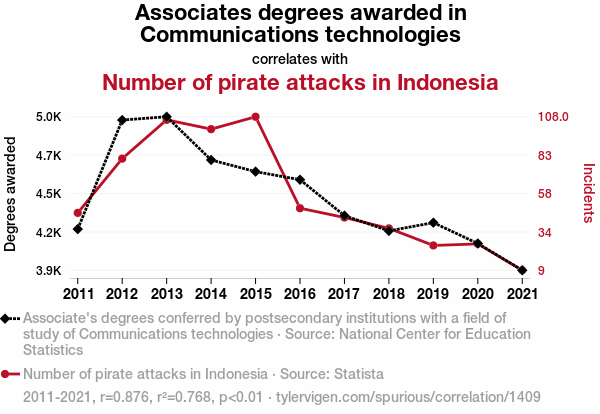 This means 76.8% of the change in the one variable (i.e., Number of pirate attacks in Indonesia) is predictable based on the change in the other (i.e., Associates degrees awarded in Communications technologies) over the 11 years from 2011 through 2021.