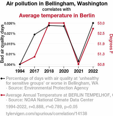 This means 78.9% of the change in the one variable (i.e., Average temperature in Berlin) is predictable based on the change in the other (i.e., Air pollution in Bellingham, Washington) over the 6 years from 1994 through 2022.