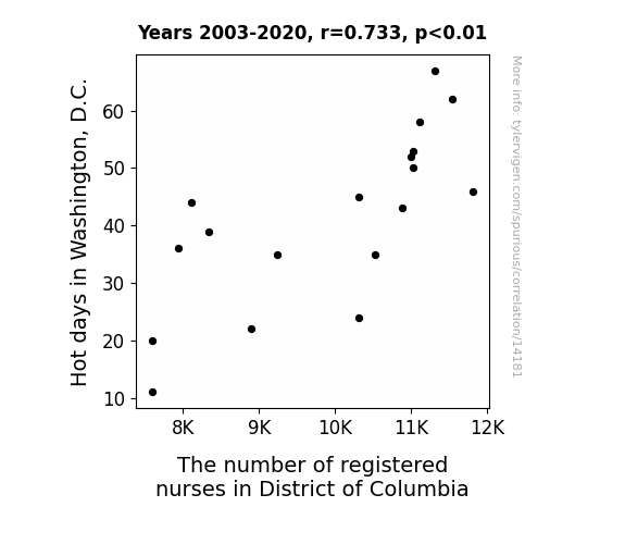 This means 53.8% of the change in the one variable (i.e., The number of registered nurses in District of Columbia) is predictable based on the change in the other (i.e., Hot days in Washington, D.C.) over the 18 years from 2003 through 2020.