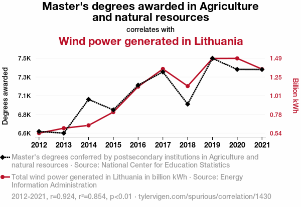 - The spurious research paper: The Wind Beneath Our Degrees: Exploring the Relationship Between Agriculture and Natural Resources Master's Degrees and Wind Power Generated in Lithuania