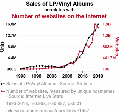 A linear line chart with years as the X-axis and two variables on the Y-axis. The first variable is Sales of LP/Vinyl Albums and the second variable is Number of websites on the internet.  The chart goes from 1993 to 2018, and the two variables track closely in value over that time. Small Image