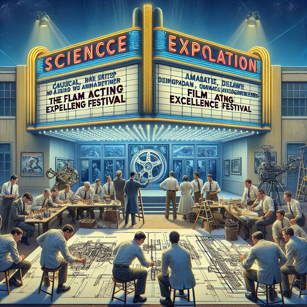 User prompt: Please respond with an image generation prompt that would be likely to create an interesting visual using DALLE-3, using the following style: [ A Discovery magazine cover image ] and depicting this scene: Picture a movie theater marquee with "Tom Hanks Festival" displayed in big letters, surrounded by the names of his famous films. In front of the theater, a group of mechanical engineers in Delaware are gathered around a large blueprint, brainstorming and designing new mechanical systems. Keep the visual depiction simple. Do not include any words or speech bubbles.