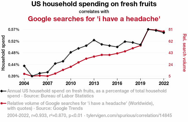 This means 87% of the change in the one variable (i.e., Google searches for 'i have a headache') is predictable based on the change in the other (i.e., US household spending on fresh fruits) over the 19 years from 2004 through 2022.
