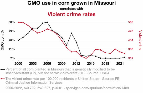 This means 62.7% of the change in the one variable (i.e., Violent crime rates) is predictable based on the change in the other (i.e., GMO use in corn grown in Missouri) over the 23 years from 2000 through 2022.