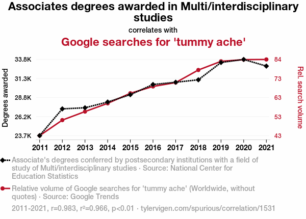 - The spurious research paper: The Belly of the Beast: An Examination of the Association Between Associates Degrees in Multi/Interdisciplinary Studies and Google Searches for 'Tummy Ache'
