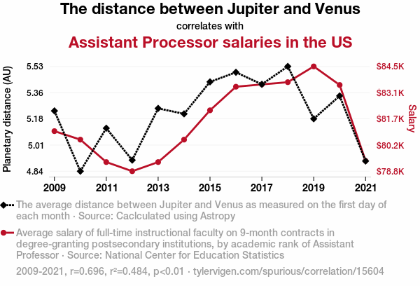 This means 48.4% of the change in the one variable (i.e., Assistant Processor salaries in the US) is predictable based on the change in the other (i.e., The distance between Jupiter and Venus) over the 13 years from 2009 through 2021.