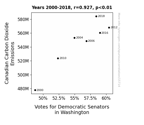 This means 86% of the change in the one variable (i.e., Votes for Democratic Senators in Washington) is predictable based on the change in the other (i.e., Canadian Carbon Dioxide Emissions) over the 7 years from 2000 through 2018.