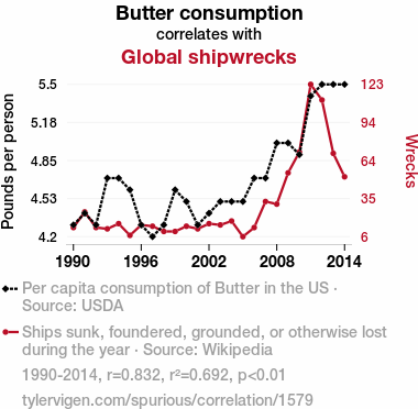 butter consumption, global shipwrecks, statistical analysis, correlation coefficient, causal mechanisms