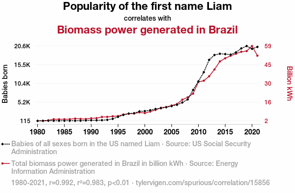This means 98.3% of the change in the one variable (i.e., Biomass power generated in Brazil) is predictable based on the change in the other (i.e., Popularity of the first name Liam) over the 42 years from 1980 through 2021.