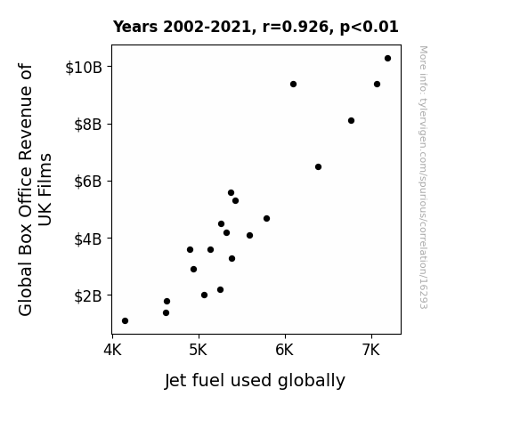 This means 85.7% of the change in the one variable (i.e., Jet fuel used globally) is predictable based on the change in the other (i.e., Global Box Office Revenue of UK Films) over the 20 years from 2002 through 2021.