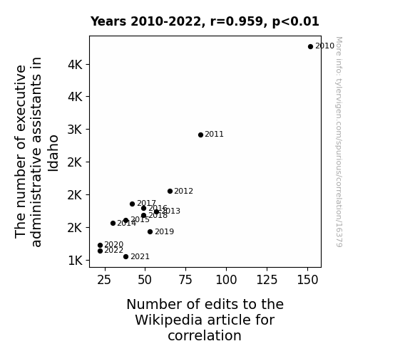 This means 92.1% of the change in the one variable (i.e., Number of edits to the Wikipedia article for correlation) is predictable based on the change in the other (i.e., The number of executive administrative assistants in Idaho) over the 13 years from 2010 through 2022.