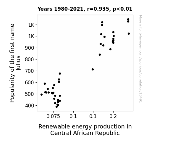 This means 87.4% of the change in the one variable (i.e., Renewable energy production in Central African Republic) is predictable based on the change in the other (i.e., Popularity of the first name Julius) over the 42 years from 1980 through 2021.