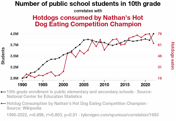 - The spurious research paper: Grade 10 Gastronomy: Exploring the Correlation Between 10th Grade Student Population and Hot Dog Consumption Among Nathan's Hot Dog Eating Champions