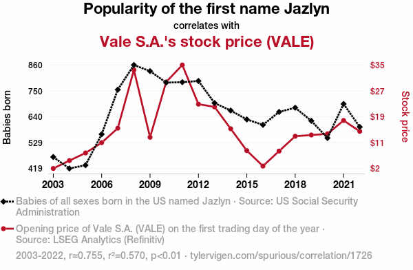 Jazlyn name popularity, Vale stock volatility, correlation between name popularity and stock performance, human names and stock prices, Jazlyn name prevalence and Vale stock fate, correlation coefficient and significance level, stock market influence and human names