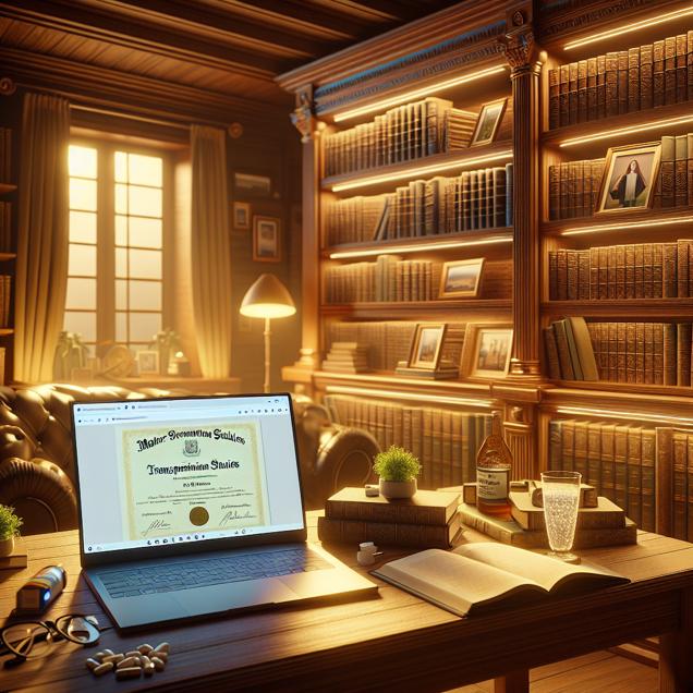 Prompt: [A photo-realistic image] Create a cozy study room with warm lighting and rich wooden bookshelves filled with books. Display a Master's degree in Transportation prominently on the wall in an elegant frame. On the desk, place an open laptop with the Google search tab visible, and a half-drunk glass of water along with a couple of headache relief tablets. Ensure the room exudes an atmosphere of warmth, accomplishment, and just a hint of post-celebration recovery. The depiction should include only scenes, people, and objects, it should not include text or speech bubbles.