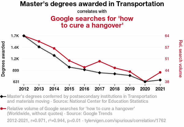 - The spurious research paper: Miles to Mojitos: Analyzing the Correlation Between Master's Degrees in Transportation and 'How to Cure a Hangover' Google Searches