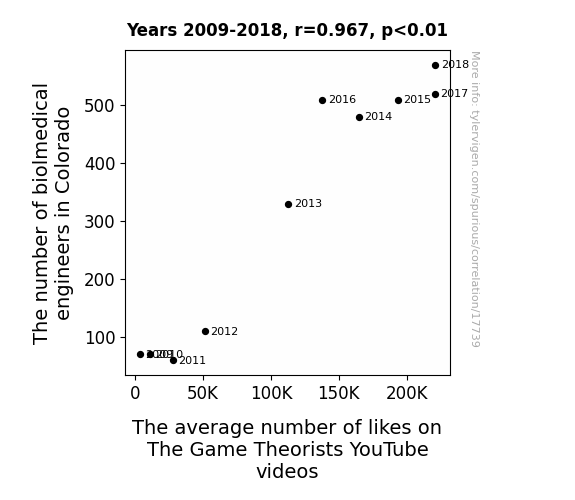 This means 93.4% of the change in the one variable (i.e., The average number of likes on The Game Theorists YouTube videos) is predictable based on the change in the other (i.e., The number of biolmedical engineers in Colorado) over the 10 years from 2009 through 2018.