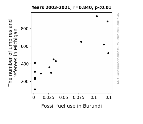 Our analysis of the data revealed a striking correlation between the number of umpires and referees in Michigan and the fossil fuel use in Burundi. The correlation coefficient of 0.8402788 illuminated a strong positive relationship, akin to the way a powerful stadium floodlight shines on the field – bright and impossible to ignore.