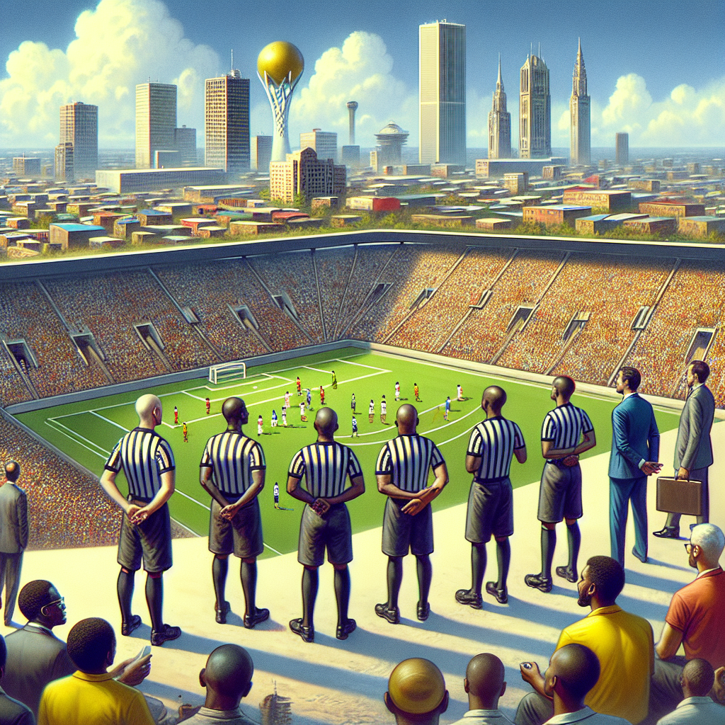 User prompt: Please respond with an image generation prompt that would be likely to create an interesting visual using DALLE-3, using the following style: [ Concept art ] and depicting this scene: In a stadium in Michigan, several umpires and referees are seen standing at the sidelines, discussing game strategies. In the background, a fleet of cars and buses in Burundi can be seen, emitting exhaust as they transport people across the city. Keep the visual depiction simple. Do not include any words or speech bubbles.