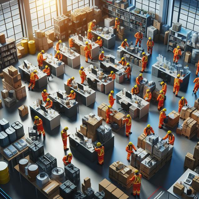 Prompt: [ A photo-realistic image ] An overhead view of a bustling office in Kansas, with a team of hazardous materials removal workers meticulously donning protective gear. They are surrounded by crates and barrels containing hazardous materials, and are in the process of carefully unpacking and preparing them for disposal. In the corner of the room, an office computer displays a detailed Google search for "3Blue1Brown," adding a subtle layer of interest to the scene. The depiction should include only scenes, people, and objects, it should not include text or speech bubbles.