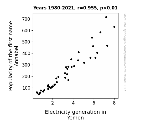 This means 91.1% of the change in the one variable (i.e., Electricity generation in Yemen) is predictable based on the change in the other (i.e., Popularity of the first name Annabel) over the 42 years from 1980 through 2021.