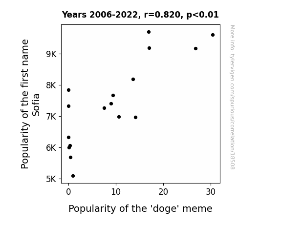 This means 67.2% of the change in the one variable (i.e., Popularity of the 'doge' meme) is predictable based on the change in the other (i.e., Popularity of the first name Sofia) over the 17 years from 2006 through 2022.
