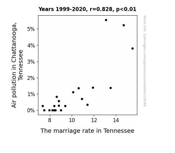 This means 68.5% of the change in the one variable (i.e., The marriage rate in Tennessee) is predictable based on the change in the other (i.e., Air pollution in Chattanooga, Tennessee) over the 22 years from 1999 through 2020.