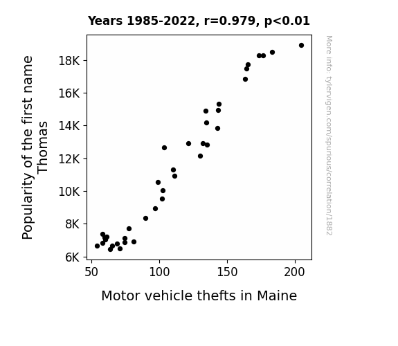 This means 95.9% of the change in the one variable (i.e., Motor vehicle thefts in Maine) is predictable based on the change in the other (i.e., Popularity of the first name Thomas) over the 38 years from 1985 through 2022.