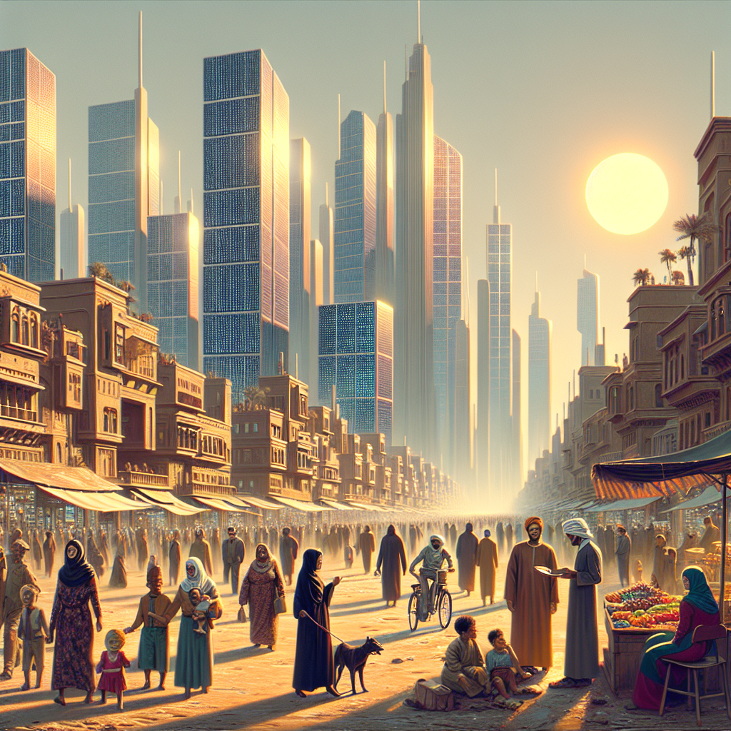 ChatGPT: Generate a bustling scene in an Egyptian city with towering buildings adorned with sleek solar panels that glint under the sunlight. A sense of celebration should emanate from the citizens as they enjoy the abundant energy generated by the solar panels. The scene should reflect the harmonious blend of modern technology and ancient architecture, echoing the growing popularity of solar power in Egypt. The imagery should evoke a futuristic and optimistic vibe reminiscent of a scene from 'Star Wars'.