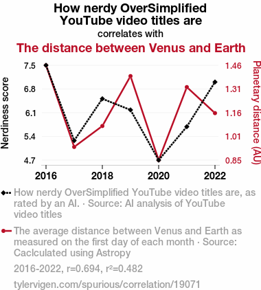 This means 48.2% of the change in the one variable (i.e., The distance between Venus and Earth) is predictable based on the change in the other (i.e., How nerdy OverSimplified YouTube video titles are) over the 7 years from 2016 through 2022.