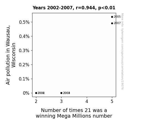 This means 89% of the change in the one variable (i.e., Number of times 21 was a winning Mega Millions number) is predictable based on the change in the other (i.e., Air pollution in Wausau, Wisconsin) over the 6 years from 2002 through 2007.
