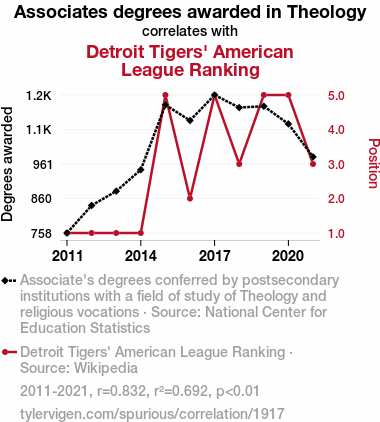 User prompt: Please provide potential search keywords for a paper titled Holy Rollers and Batting Averages: The Connection Between Theology Degrees and Detroit Tigers' Chronology with an abstract of This study examines the intriguing relationship between the number of Associate degrees awarded in Theology and religious vocations and the American League ranking of the Detroit Tigers. Utilizing data from the National Center for Education Statistics and the Wikipedia pages of the Detroit Tigers, our research team delved into this seemingly incongruous connection. The correlation coefficient of 0.8316076 and p < 0.01 for the period from 2011 to 2021 provided compelling evidence of a noteworthy association.