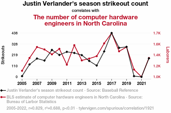 - The spurious research paper: Pitching Strikes, Hiring Engineers: The Curious Correlation Between Justin Verlander's Season Strikeout Count and Computer Hardware Engineers in North Carolina