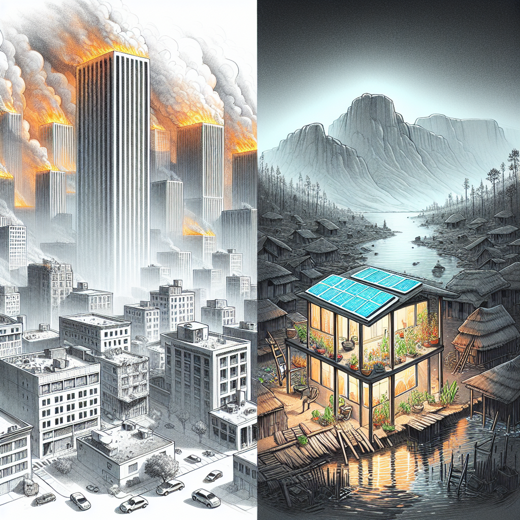 ChatGPT: Create an image that embodies the contrast between environmental challenges and sustainable solutions. In a scene of Helena, Montana shrouded in hazy smoke from wildfires, showcase a brutalist architectural structure with a sense of weathered resilience. In contrast, depict a simple, rural setting in Benin with a small, vibrant solar panel generating sustainable energy amidst the community. Capture the stark difference in environmental impact and the hopeful promise of renewable energy.