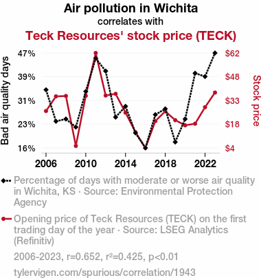 This means 42.5% of the change in the one variable (i.e., Teck Resources' stock price (TECK)) is predictable based on the change in the other (i.e., Air pollution in Wichita) over the 18 years from 2006 through 2023.