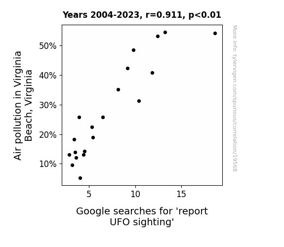This means 83% of the change in the one variable (i.e., Google searches for 'report UFO sighting') is predictable based on the change in the other (i.e., Air pollution in Virginia Beach, Virginia) over the 20 years from 2004 through 2023.
