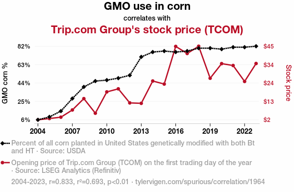 This means 69.3% of the change in the one variable (i.e., Trip.com Group's stock price (TCOM)) is predictable based on the change in the other (i.e., GMO use in corn) over the 20 years from 2004 through 2023.