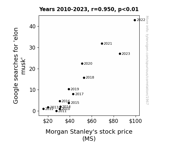 This means 90.2% of the change in the one variable (i.e., Morgan Stanley's stock price (MS)) is predictable based on the change in the other (i.e., Google searches for 'elon musk') over the 14 years from 2010 through 2023.
