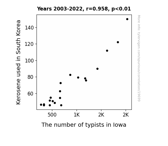This means 91.8% of the change in the one variable (i.e., The number of typists in Iowa) is predictable based on the change in the other (i.e., Kerosene used in South Korea) over the 20 years from 2003 through 2022.