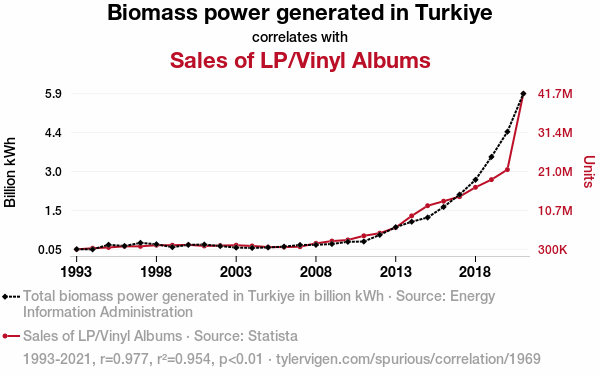 This means 95.4% of the change in the one variable (i.e., Sales of LP/Vinyl Albums) is predictable based on the change in the other (i.e., Biomass power generated in Turkiye) over the 29 years from 1993 through 2021.